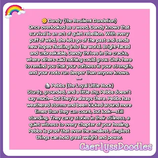 Together, they’re wind and wonder. Dandy, rooted in grit and softness, knows what it means to survive in the harshest places. Whimsy, made of color and chaos, turns every stray breeze into a new beginning. While Dandy lets go of the past one seed at a time, Whimsy gathers each one like a treasure, spreading it with joyful purpose.